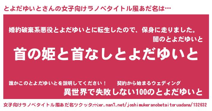 | 胡散臭い通販商品みたいなあだ名 | 『絶対に幸福をもたらす健康食品…その名も「とよだゆいと」』 |