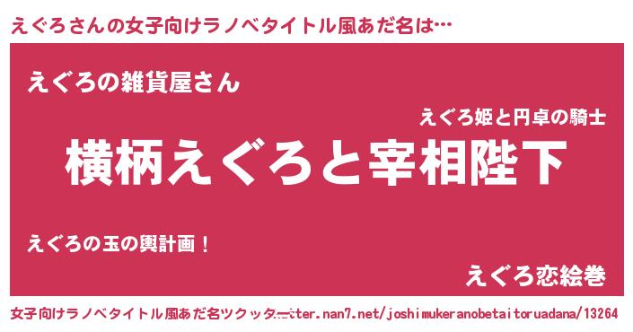 えぐろさんの女子向けラノベタイトル風あだ名は… 『横柄えぐろと宰相陛下』『えぐろの雑貨屋さん』『えぐろ恋絵巻』 ツクッター #女子向けラノベタイトル風あだ名ツクッター http://tkutter.nan7.net/joshimukeranobetaitoruadana/13264/