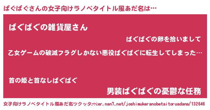 | 胡散臭い通販商品みたいなあだ名 | 『世界中を虜にした100年もののヴィンテージワイン…その名も「ばぐばぐ」』 |