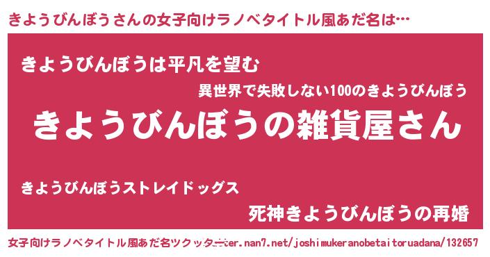 | 男性向けラノベタイトル風あだ名 | 『やはりきようびんぼうの青春ラブコメはまちがっている 』 |