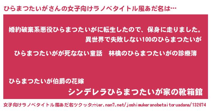 | 男性向けラノベタイトル風あだ名 | 『魔弾の王とひらまつたいが』 |