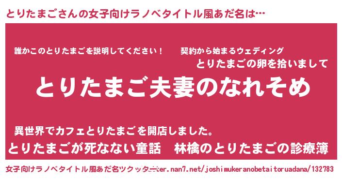 | 男性向けラノベタイトル風あだ名 | 『おまえをオタクにしてやるから、俺をとりたまごにしてくれ! 』 |