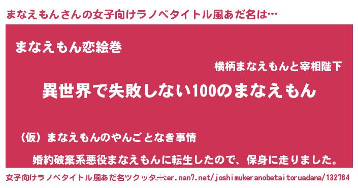 | 男性向けラノベタイトル風あだ名 | 『まなえもんという概念が存在しない退屈な世界 』 |