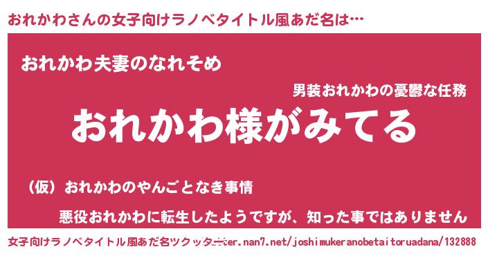 | 男性向けラノベタイトル風あだ名 | 『おれかわの嫁は女の子じゃないと思った?』 |