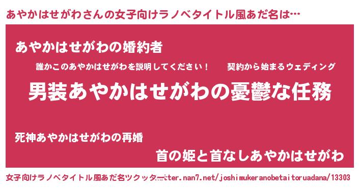 | 男性向けラノベタイトル風あだ名 | 『冴えないあやかはせがわの育てかた』 |
