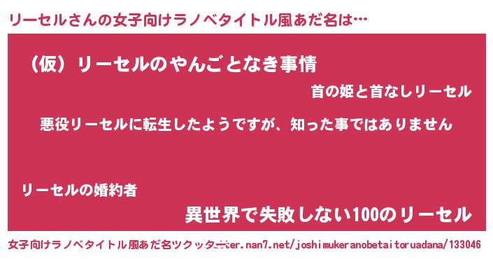 | 胡散臭い通販商品みたいなあだ名 | 『あなたにだけ特別に提供する100年もののヴィンテージワイン…その名も「リーセル」』 |