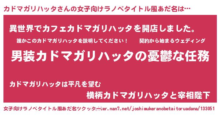 | ヘコむあだ名 | 『カドマガリハッタ(爆)』『カドにゅー』 |