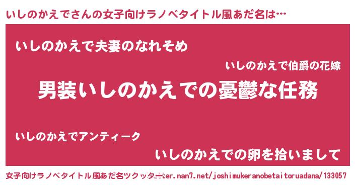 いしのかえでさんの女子向けラノベタイトル風あだ名は… 『男装いしのかえでの憂鬱な任務』『いしのかえで夫妻のなれそめ』『いしのかえでの卵を拾いまして』 ツクッター #女子向けラノベタイトル風あだ名ツクッター http://tkutter.nan7.net/joshimukeranobetaitoruadana/133057/