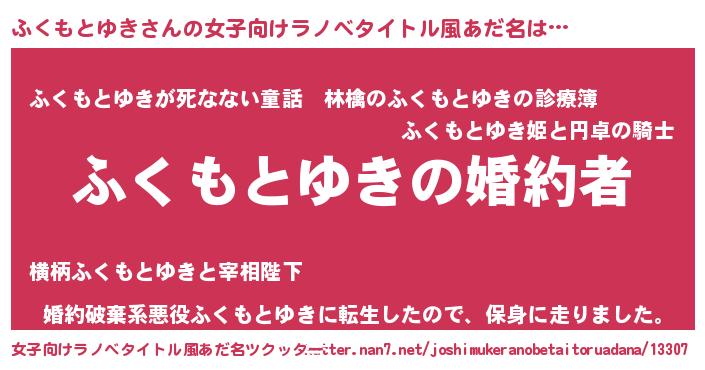 | 男性向けラノベタイトル風あだ名 | 『うちの娘の為ならば、俺はもしかしたらふくもとゆきも倒せるかもしれない。』 |