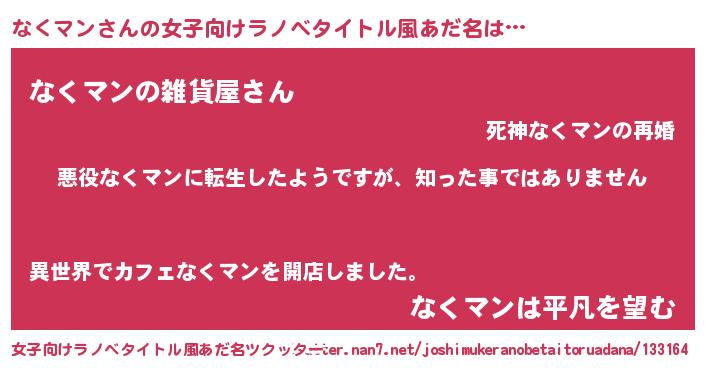 なくマンさんの女子向けラノベタイトル風あだ名は… 『悪役なくマンに転生したようですが、知った事ではありません』『なくマンの雑貨屋さん』『なくマンは平凡を望む』 ツクッター #女子向けラノベタイトル風あだ名ツクッター http://tkutter.nan7.net/joshimukeranobetaitoruadana/133164/