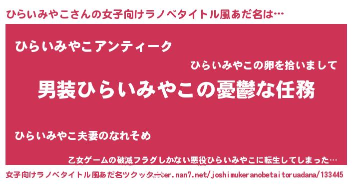 | 男性向けラノベタイトル風あだ名 | 『うちのひらいみやこが世界を掌握している!』 |