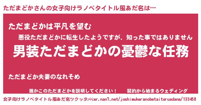 ただまどかさんの女子向けラノベタイトル風あだ名は… 『男装ただまどかの憂鬱な任務』『ただまどかは平凡を望む』『誰かこのただまどかを説明してください! ~契約から始まるウェディング~』 ツクッター #女子向けラノベタイトル風あだ名ツクッター http://tkutter.nan7.net/joshimukeranobetaitoruadana/133458/
