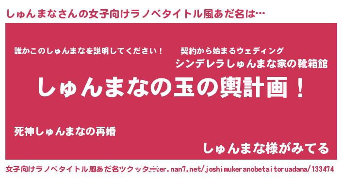 | 男性向けラノベタイトル風あだ名 | 『しゅんまな~年齢イコール彼女いない歴の魔法使い~』 |