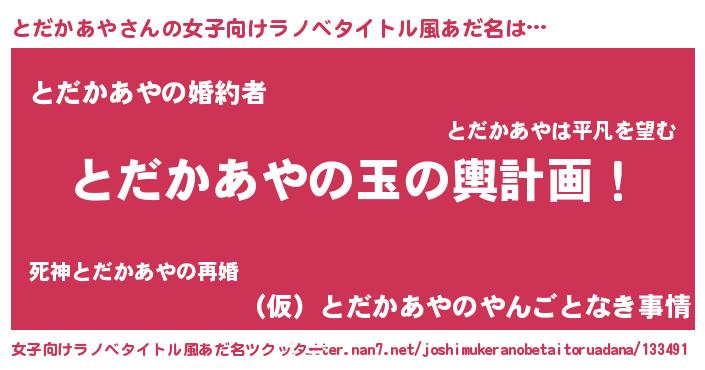 | 男性向けラノベタイトル風あだ名 | 『とだかあや~年齢イコール彼女いない歴の魔法使い~』 |