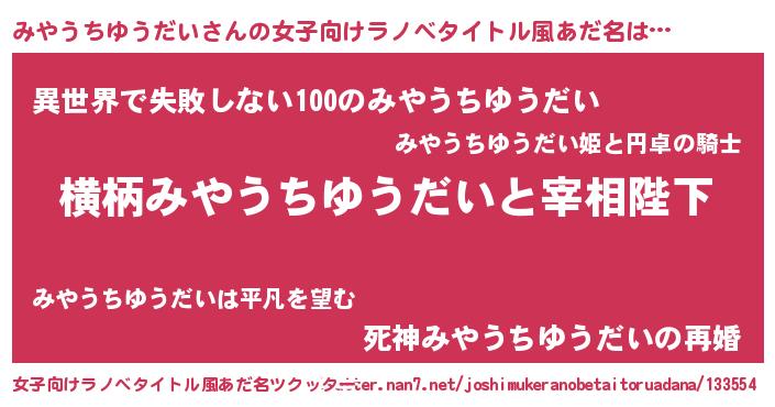 | 男性向けラノベタイトル風あだ名 | 『みやうちゆうだいに滅ぼされるだけの簡単なお仕事です』 |