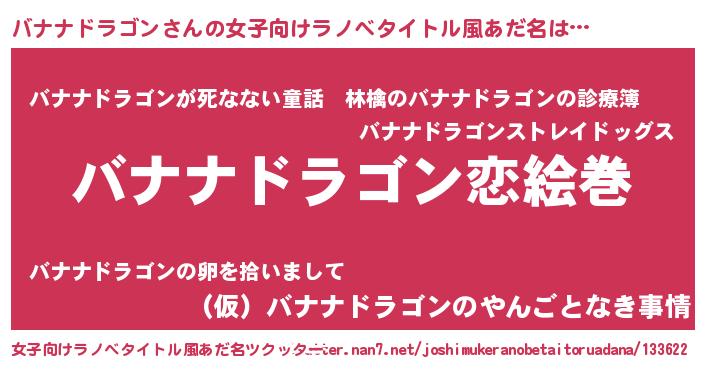 | 男性向けラノベタイトル風あだ名 | 『おまえをオタクにしてやるから、俺をバナナドラゴンにしてくれ! 』 |
