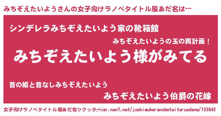 | 男性向けラノベタイトル風あだ名 | 『みちぞえたいようの嫁は女の子じゃないと思った?』 |