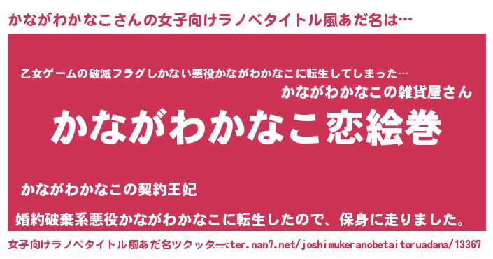| 男性向けラノベタイトル風あだ名 | 『おまえをオタクにしてやるから、俺をかながわかなこにしてくれ! 』 |