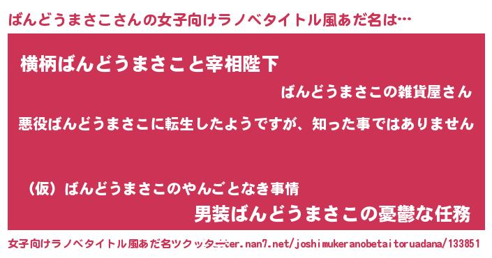 | 男性向けラノベタイトル風あだ名 | 『この素晴らしい世界にばんどうまさこを!』 |