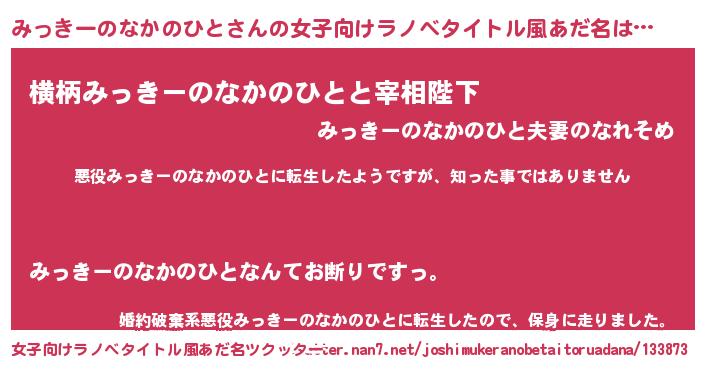 | 男性向けラノベタイトル風あだ名 | 『この素晴らしい世界にみっきーのなかのひとを!』 |