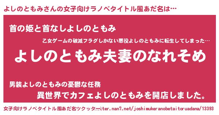 | 男性向けラノベタイトル風あだ名 | 『おまえをオタクにしてやるから、俺をよしのともみにしてくれ! 』 |