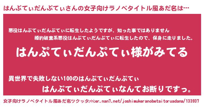 | 男性向けラノベタイトル風あだ名 | 『はんぷてぃだんぷてぃの嫁は女の子じゃないと思った?』 |