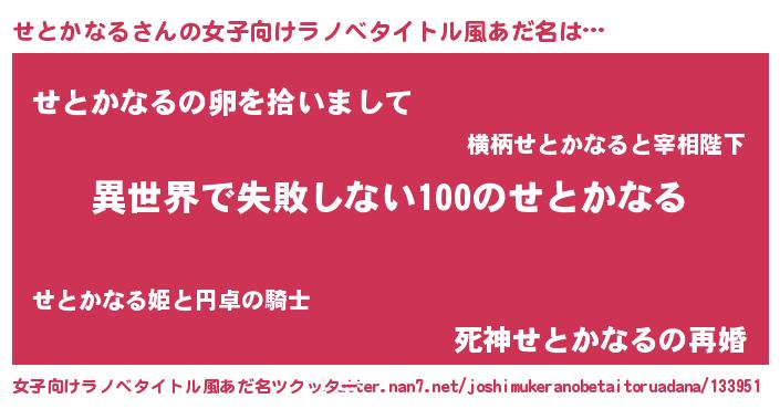 | 男性向けラノベタイトル風あだ名 | 『せとかなるという概念が存在しない退屈な世界 』 |