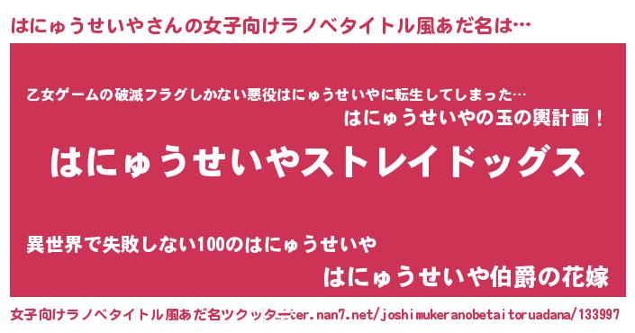 | 男性向けラノベタイトル風あだ名 | 『Re:はにゅうせいやから始める異世界生活』 |
