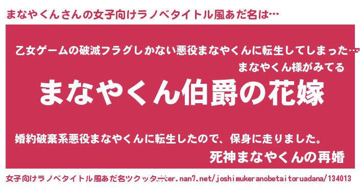 | 男性向けラノベタイトル風あだ名 | 『うちの娘の為ならば、俺はもしかしたらまなやくんも倒せるかもしれない。』 |