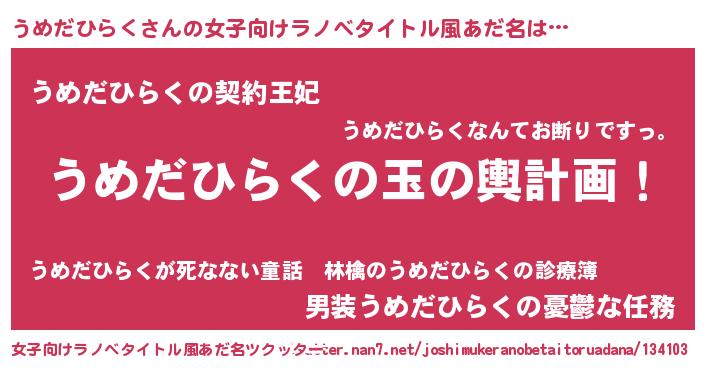 | 男性向けラノベタイトル風あだ名 | 『うめだひらく~年齢イコール彼女いない歴の魔法使い~』 |