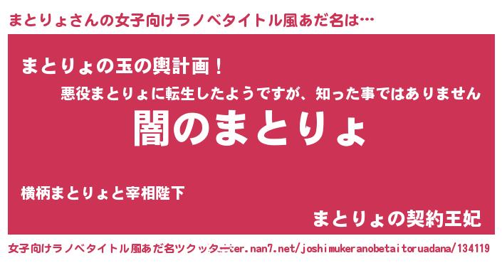 | 男性向けラノベタイトル風あだ名 | 『Re:まとりょから始める異世界生活』 |