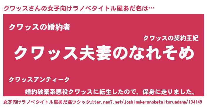 | 男性向けラノベタイトル風あだ名 | 『おまえをオタクにしてやるから、俺をクワッスにしてくれ! 』 |