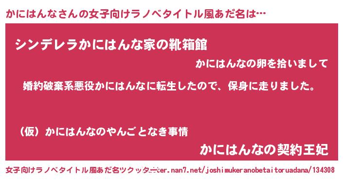 | 男性向けラノベタイトル風あだ名 | 『カニハンナスレイヤー』 |