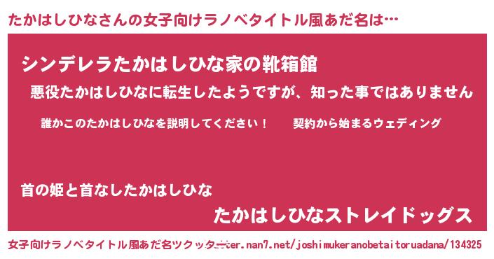 | 男性向けラノベタイトル風あだ名 | 『タカハシヒナアートオンライン』 |