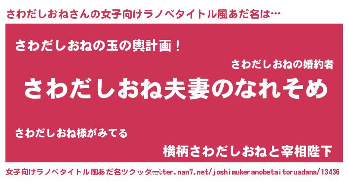 | 男性向けラノベタイトル風あだ名 | 『おまえをオタクにしてやるから、俺をさわだしおねにしてくれ! 』 |