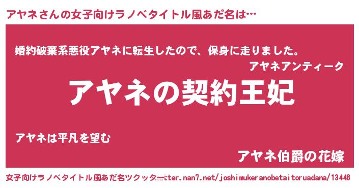 | 男性向けラノベタイトル風あだ名 | 『アヤネという概念が存在しない退屈な世界 』 |