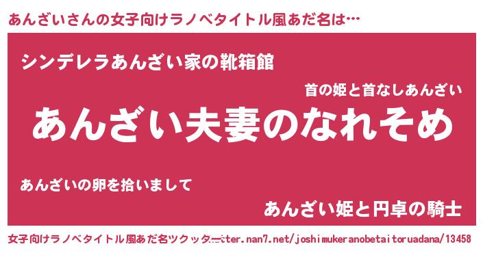 | 男性向けラノベタイトル風あだ名 | 『おまえをオタクにしてやるから、俺をあんざいにしてくれ! 』 |