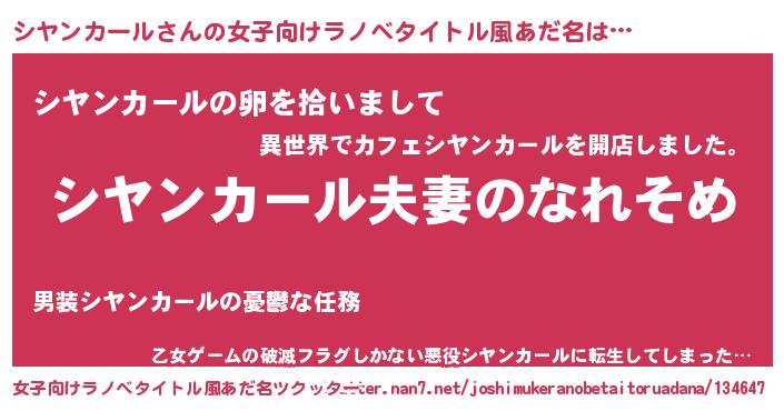 | 男性向けラノベタイトル風あだ名 | 『おまえをオタクにしてやるから、俺をシヤンカールにしてくれ! 』 |