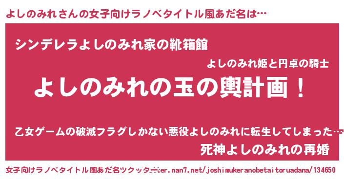 | 男性向けラノベタイトル風あだ名 | 『よしのみれ~年齢イコール彼女いない歴の魔法使い~』 |
