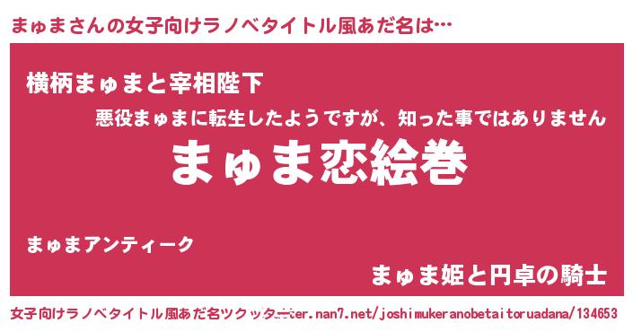 | 男性向けラノベタイトル風あだ名 | 『おまえをオタクにしてやるから、俺をまゅまにしてくれ! 』 |