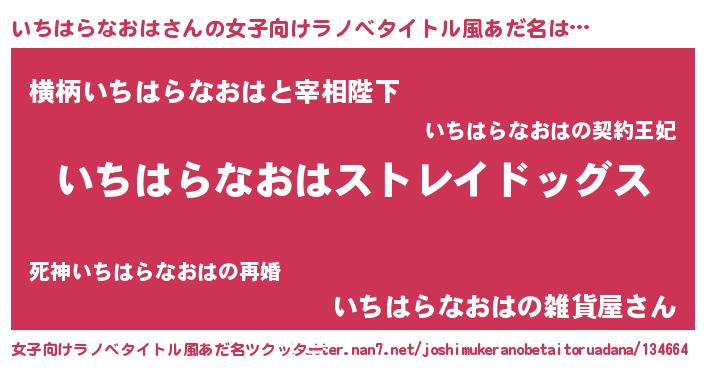いちはらなおはさんの女子向けラノベタイトル風あだ名は… 『いちはらなおはストレイドッグス』『横柄いちはらなおはと宰相陛下』『いちはらなおはの雑貨屋さん』 ツクッター #女子向けラノベタイトル風あだ名ツクッター http://tkutter.nan7.net/joshimukeranobetaitoruadana/134664/