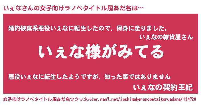 | 男性向けラノベタイトル風あだ名 | 『いぇなの嫁は女の子じゃないと思った?』 |