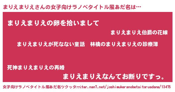 | 男性向けラノベタイトル風あだ名 | 『魔弾の王とまりえまりえ』 |