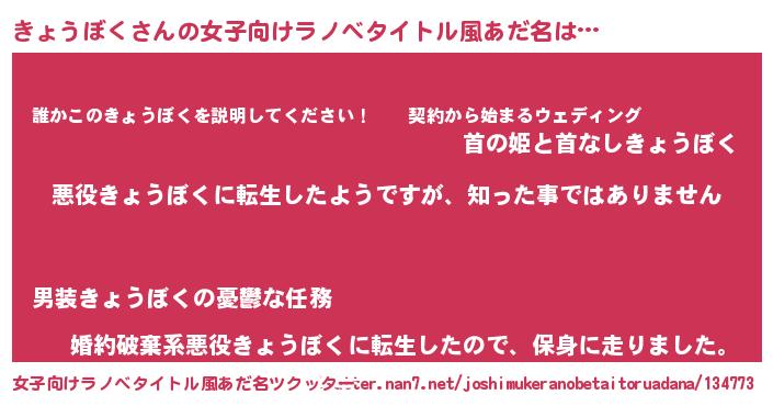 | 男性向けラノベタイトル風あだ名 | 『この素晴らしい世界にきょうぼくを!』 |