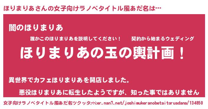 | 男性向けラノベタイトル風あだ名 | 『ほりまりあ~年齢イコール彼女いない歴の魔法使い~』 |