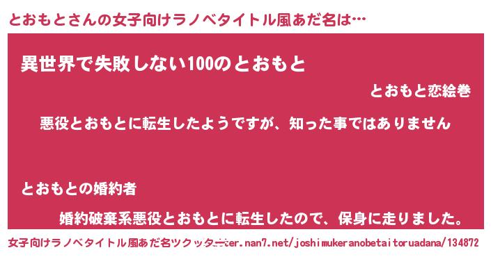 とおもとさんの女子向けラノベタイトル風あだ名は… 『悪役とおもとに転生したようですが、知った事ではありません』『異世界で失敗しない100のとおもと』『婚約破棄系悪役とおもとに転生したので、保身に走りました。』 ツクッター #女子向けラノベタイトル風あだ名ツクッター http://tkutter.nan7.net/joshimukeranobetaitoruadana/134872/