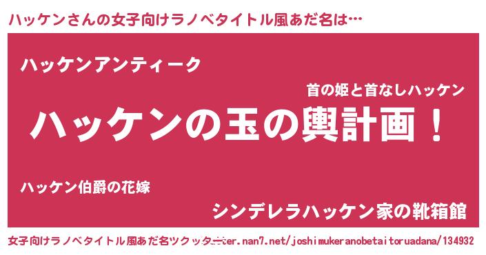 | 男性向けラノベタイトル風あだ名 | 『ハッケン~年齢イコール彼女いない歴の魔法使い~』 |