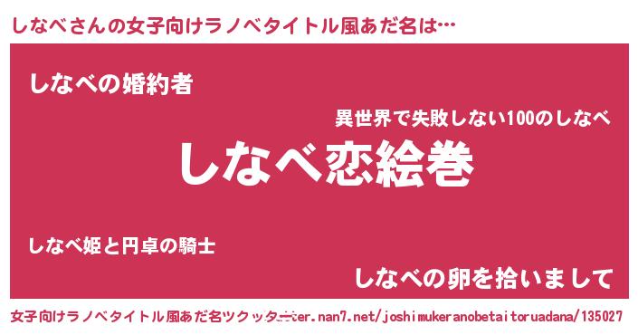 | 男性向けラノベタイトル風あだ名 | 『おまえをオタクにしてやるから、俺をしなべにしてくれ! 』 |