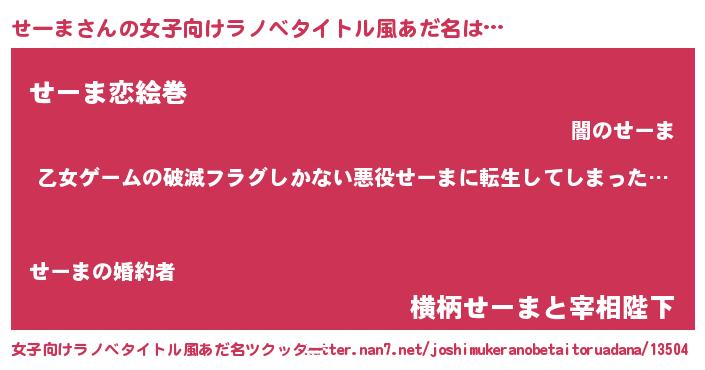 | 男性向けラノベタイトル風あだ名 | 『この素晴らしい世界にせーまを!』 |