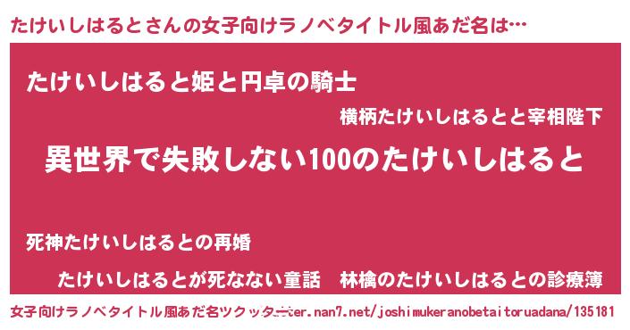 | 男性向けラノベタイトル風あだ名 | 『たけいしはるとという概念が存在しない退屈な世界 』 |